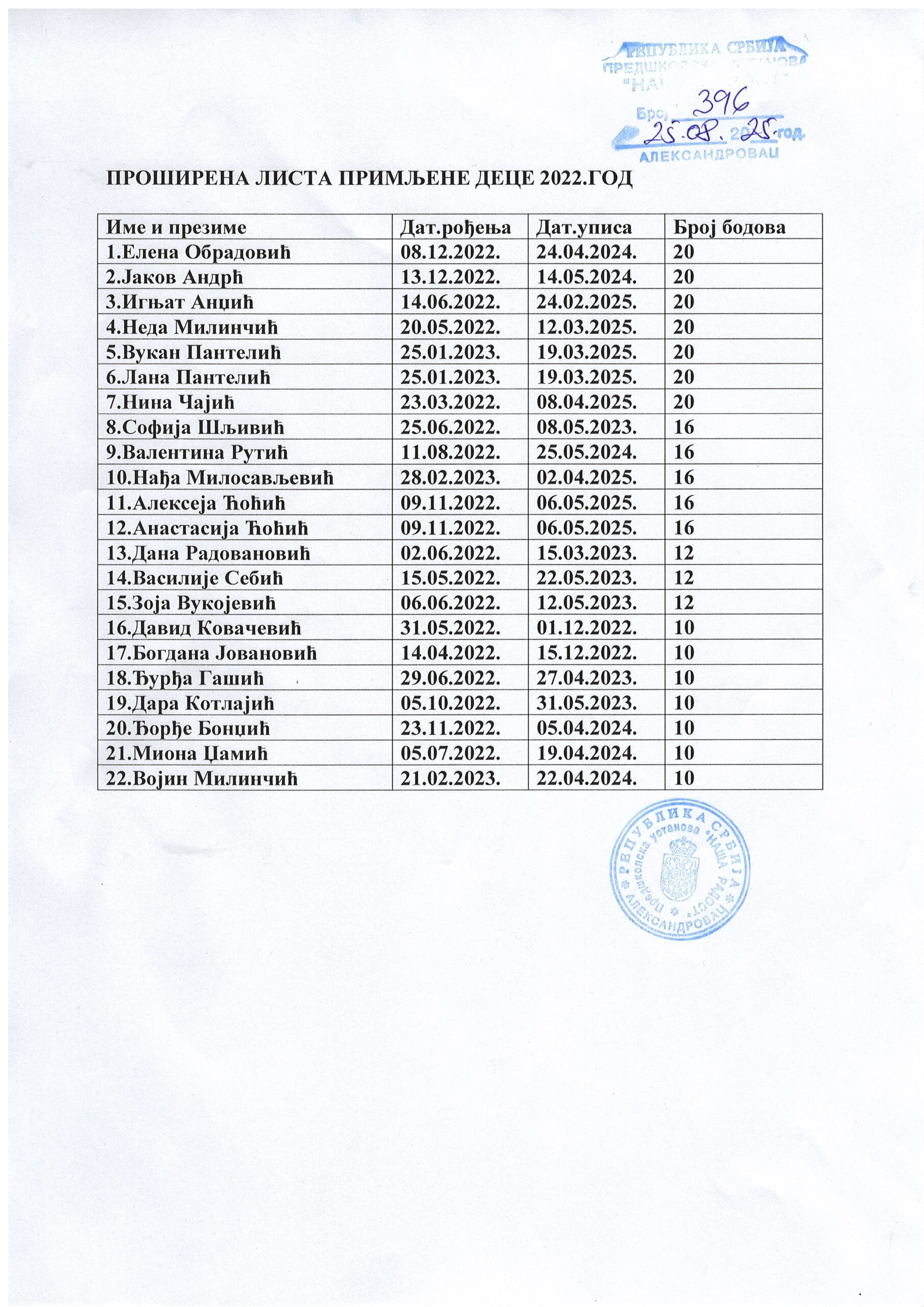 Проширена коначна ранг листа деце за пријем за 2025/2026.